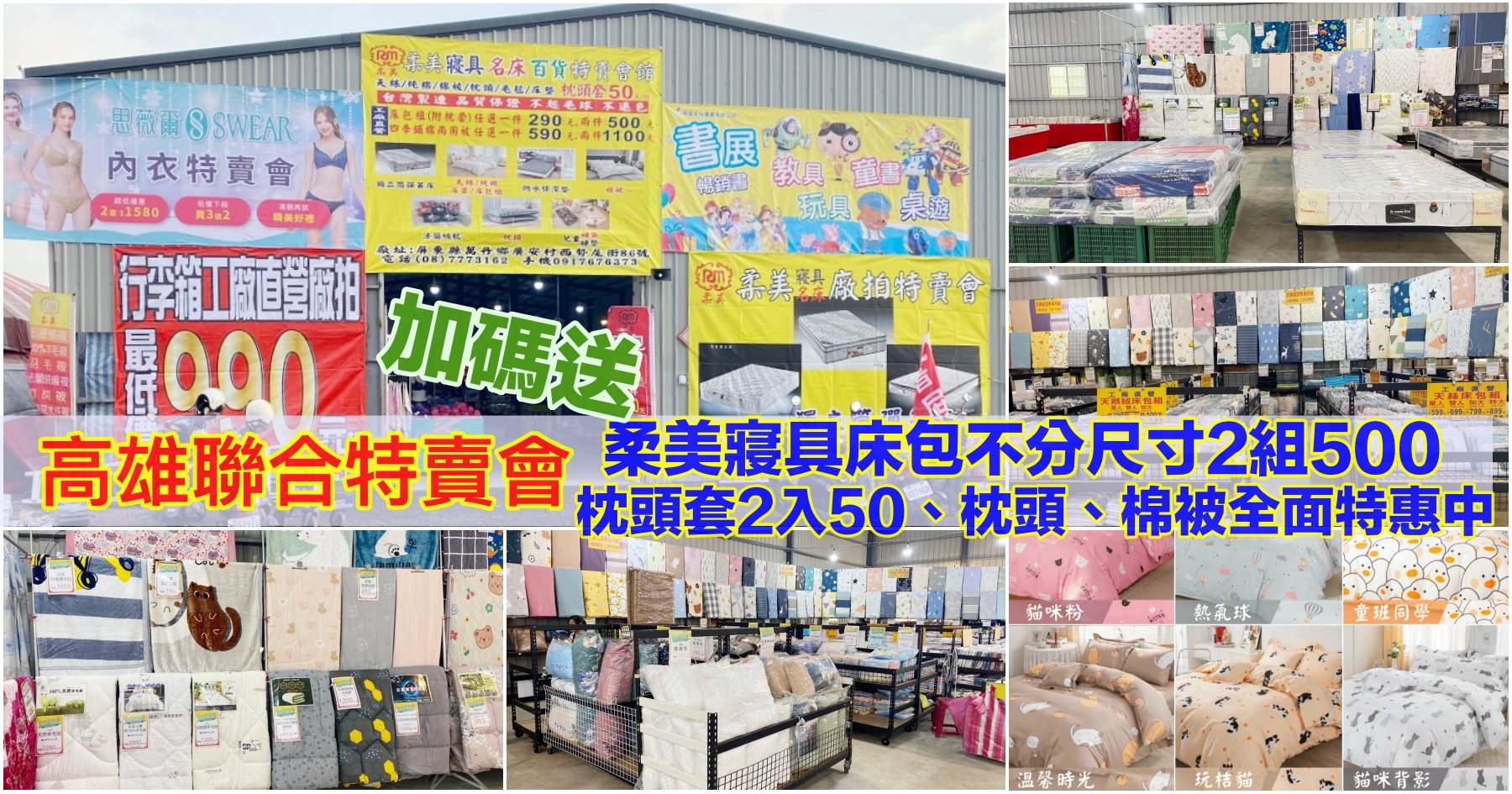 柔美寢具在高雄烏山區舉辦聯合特賣會囉!!柔美寢具床包不分尺寸兩組特價500元,等於一組250元,另有枕頭套兩入$50、舒柔健康枕$150/兩個$250、3M完全防水床包式保潔墊兩套$690,現場有多款2026年最新花色床...